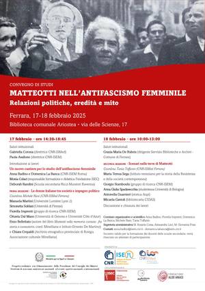 Il 17 e il 18 febbraio si terrà a Ferrara il convegno di studi "Matteotti nell'antifascismo femminile. Relazioni politiche, eredità e mito", che avrà luogo nella Biblioteca comunale Ariostea, via delle Scienze, 17.