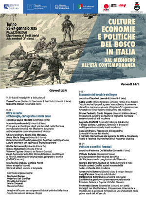 Si terrà presso il Dipartimento di Studi storici dell'Università di Torino a Palazzo Nuovo il convegno "Culture, economie e politiche del bosco in Italia dal Medioevo all'età contemporanea" nei giorni 23 e 24 gennaio 2025.