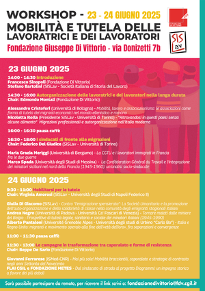 Il gruppo di lavoro "sindacalismo" della SISLav e la Fondazione Di Vittorio promuovono un workshop sul tema "Mobilità e tutela delle lavoratrici e dei lavoratori", Roma, 23-24 giugno 2025 a Roma presso la Fondazione Giuseppe Di Vittorio, in via Donizetti 7.