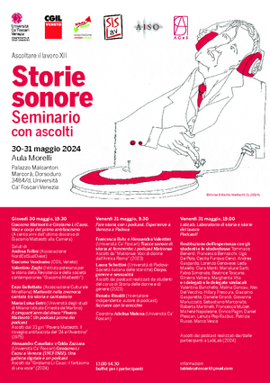 Il seminario "Storie sonore" sarà un momento di riflessione e ascolto sui podcast come strumento per fare storia. Il seminario parte dall'esperienza promossa dall'Università di Ca' Foscari "LabLab. Laboratorio di storia e storie del lavoro", ed è promosso dal Dipartimento di Studi Umanistici di Ca'...