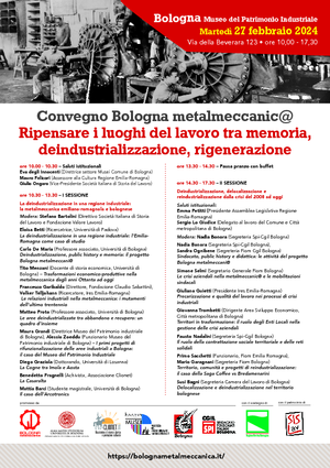 La SISLav è lieta di patrocinare il convegno "Bologna metalmeccanic@ Ripensare i luoghi del lavoro tra memoria, deindustrializzazione, rigenerazione" che si terrà il 27 febbraio 2024 presso il Museo del Patrimonio Industriale (Via della Beverara 123) dalle ore 10,00 alle 17,30.