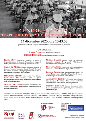 Mercoledì 13 dicembre 2023 dalle ore 10:00 alle ore 13:30 è in programma presso l'Aula B (Palazzo Ca' Dottori, Dipartimento di Scienze politiche, giuridiche e studi internazionali dell'Università di Padova) il workshop Genere e lavoro tra public history e didattica della storia