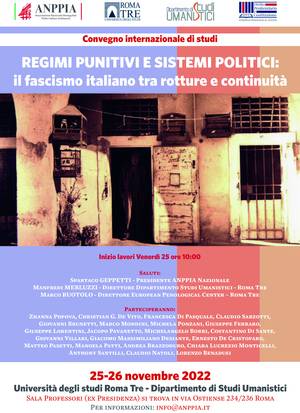 Il prossimo 25 novembre 2022, ore 10,00, presso il Dipartimento di Studi Umanistici dell’Università degli studi Roma Tre, avrà inizio il Convegno internazionale di studi “Regimi punitivi e sistemi politici: il fascismo italiano tra rotture e continuità”.