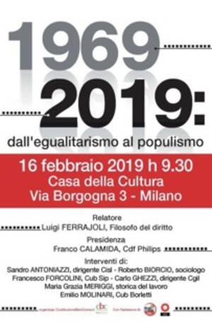 Il 16 febbraio 2019 presso la Casa della Cultura di Milano – con inizio alle ore 9 30 e conclusioni entro le 13 – Relatore Luigi Ferrajoli – presidenza: Franco Calamida – con interventi di: Sandro Antoniazzi, dirigente Cisl – Roberto Biorcio, sociologo – Francesco Forcolini, Cub Sip – Carlo Ghezzi,...