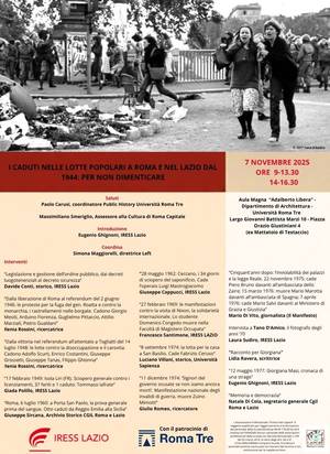 Il 7 novembre 2025, presso l’Aula Magna “Adalberto Libera” dell’Università Roma Tre, si terrà il seminario di formazione “I caduti nelle lotte popolari a Roma e nel Lazio dal 1944: per non dimenticare”, promosso da IRESS Lazio con il coinvolgimento di Proteo Fare Sapere Roma e Lazio e il patrocinio...
