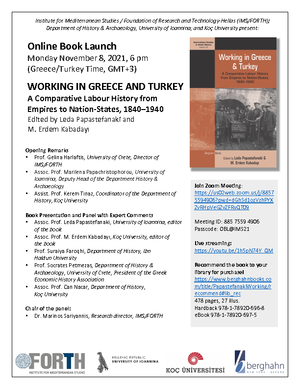 Presentazione del volume "Working in Greece and Turkey" (online, 08 novembre 2021)
